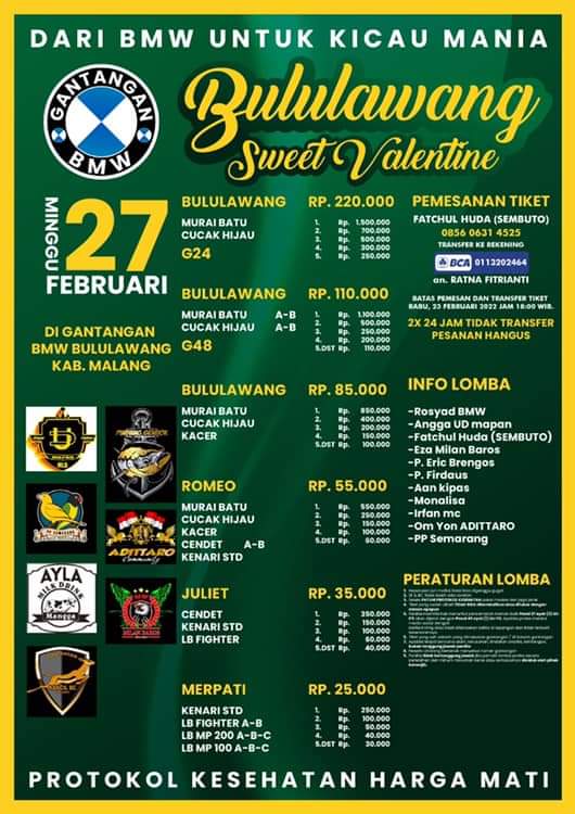 Sedangkan di kelas teratas, Bululawang harga tiket 220 ribu rupiah dihuni murai batu dan cucak hijau yang menggunakan skema G-24 dengan hadiah uang pembinaan 1.5 juta rupiah untuk dibawa pulang juara 1.