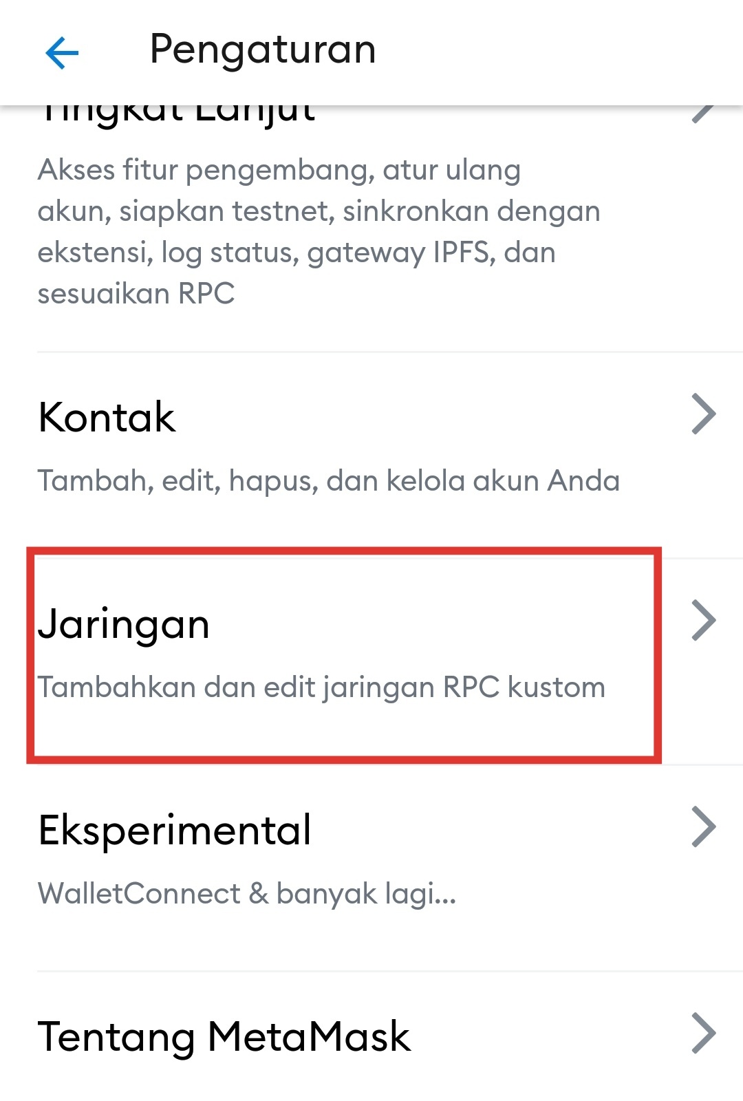 - Pilih Jaringan kemudian pilih jaringan RPC kostum.