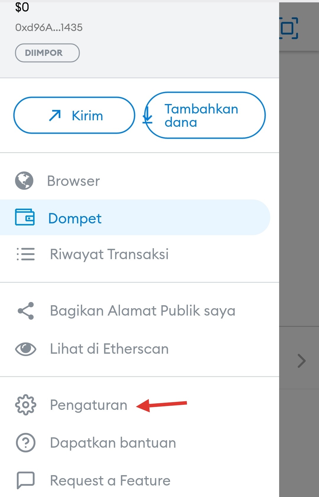 - Buka metamask dan pilih Pengaturan seperti gambar dibawah ini: