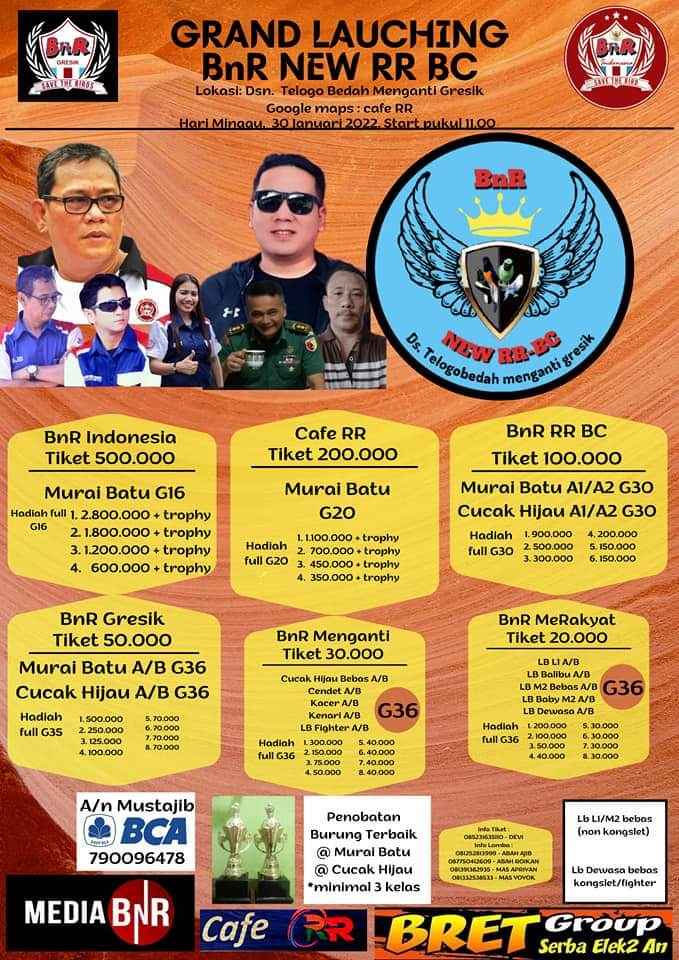Sementara di kelas utama bertajuk BnR Indonesia tiket 500 ribu rupiah dihuni murai batu yang menggunakan skema G16, masih sama peraturannya, uang pembinaan 2.8 juta rupiah keluar jika peserta full.