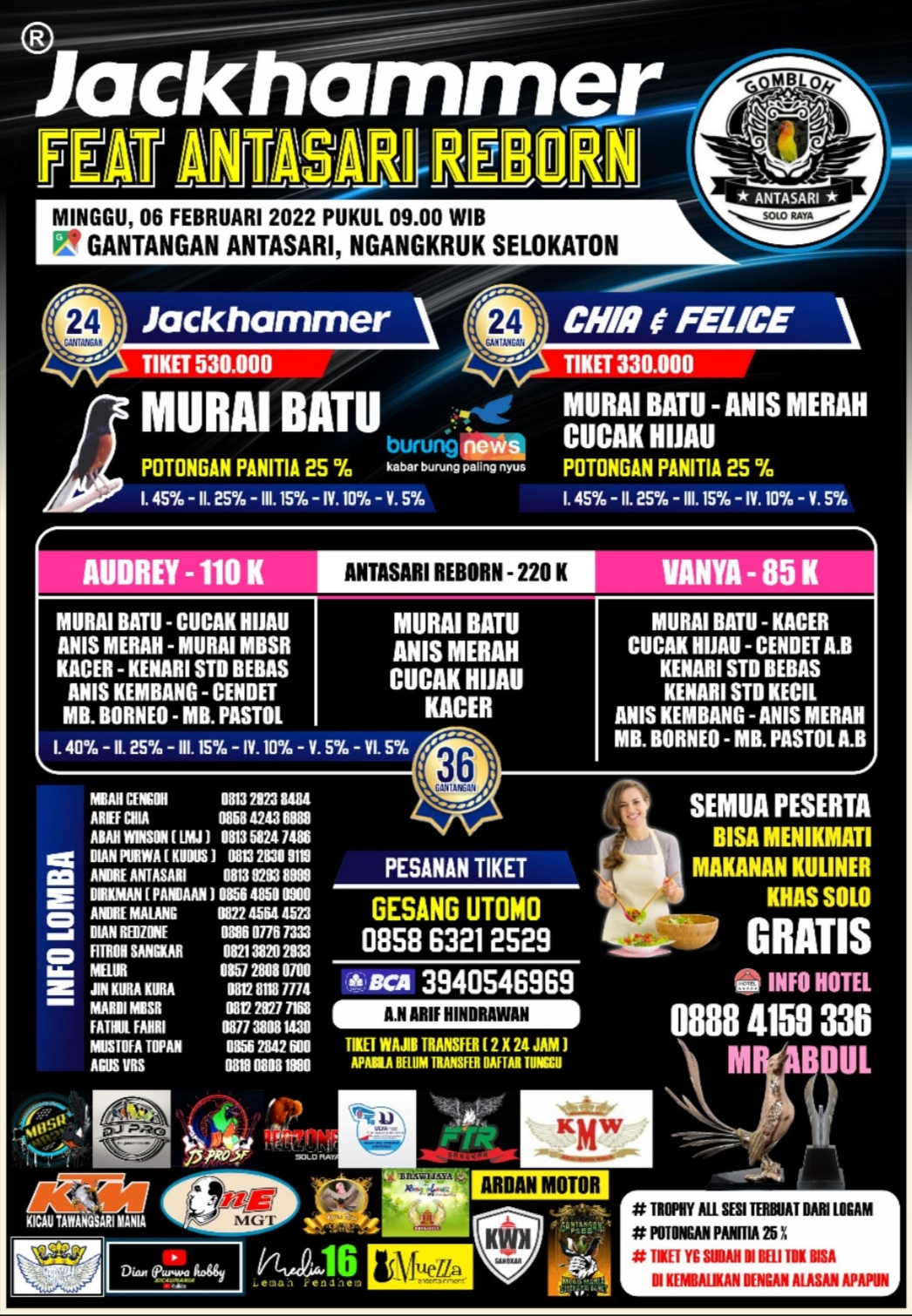 Serta harga 330 ribu rupiah (Chia & Felice) untuk kelas murai batu, anis merah, cucak hijau dan harga 530 ribu rupiah (Jack Hammer) dihuni murai batu saja, kedua harga tadi menggunakan sistem G-24.