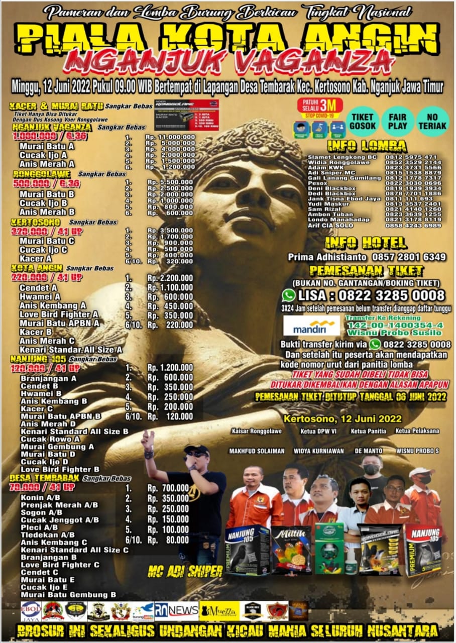 Dan, di kelas utama berjudul Nganjuk Vaganza tiket harga 1 juta rupiah dengan skema G-36, masih sama sangkar bebas, hadiah juara pertama 11 juta rupiah dihuni kelas A murai batu, cucak hijau serta anis merah.