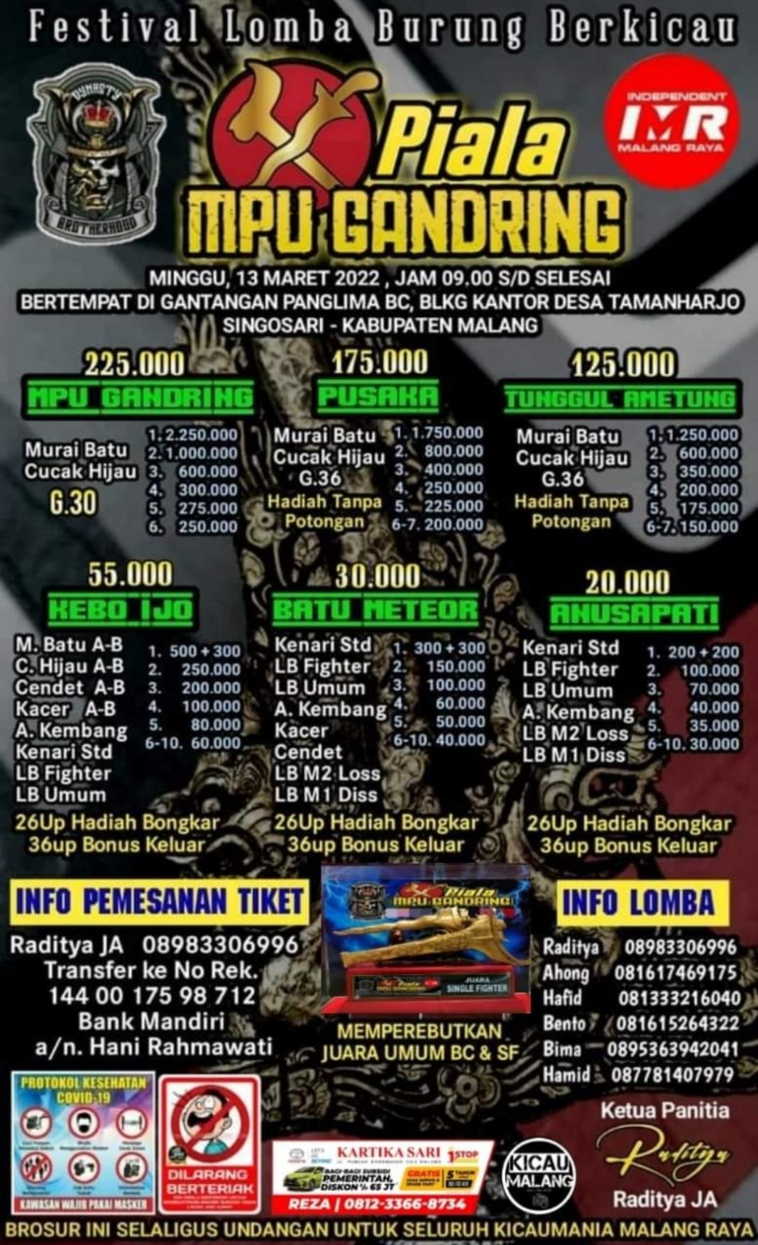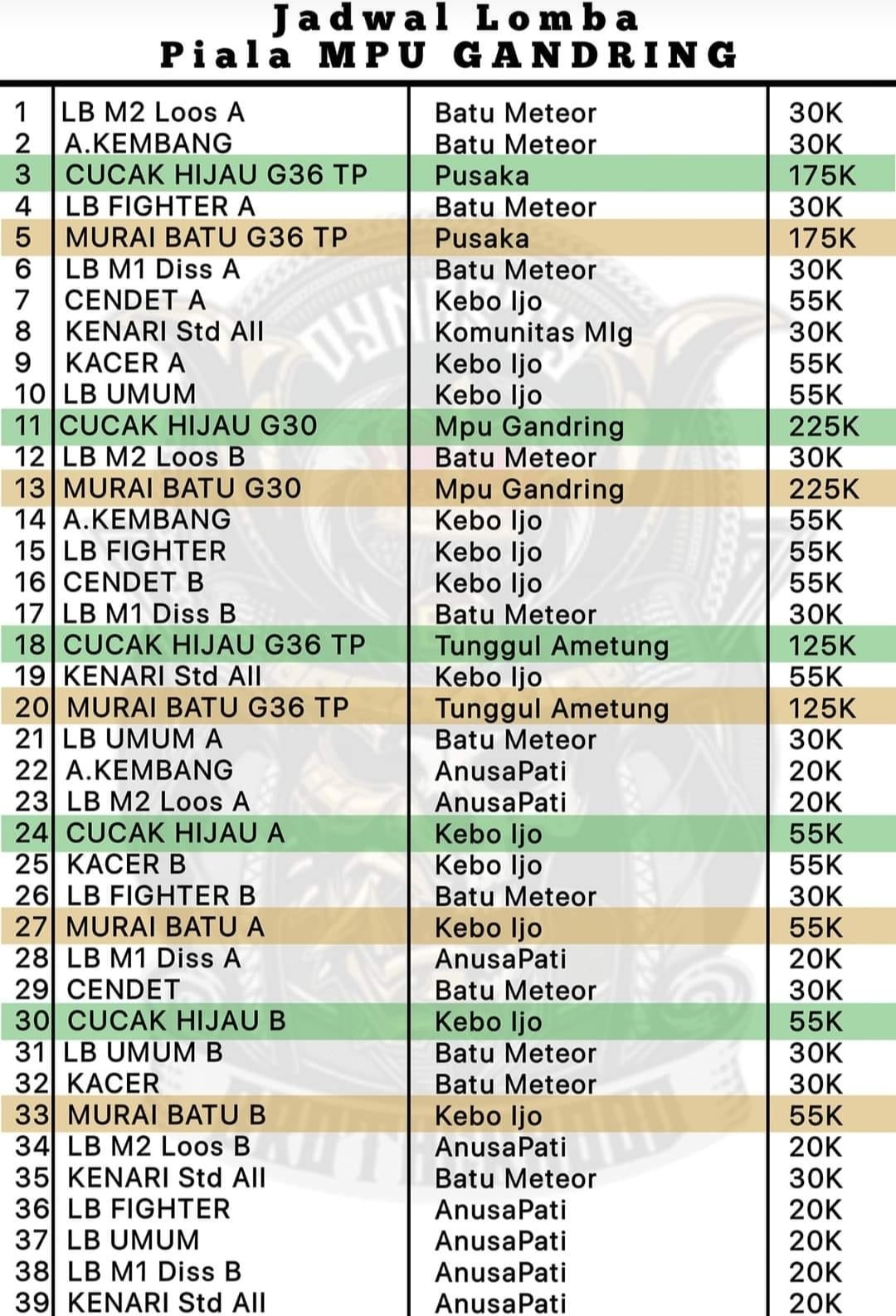 Melihat jadwal di atas dua kelas utama yang dimainkan cucak hijau Mpu Gandring G-30 serta murai batu Mpu Gandring G-30 dengan harga tiket keduanya sama 225 ribu rupiah dengan hadiah juara pertama 2.250 juta rupiah.