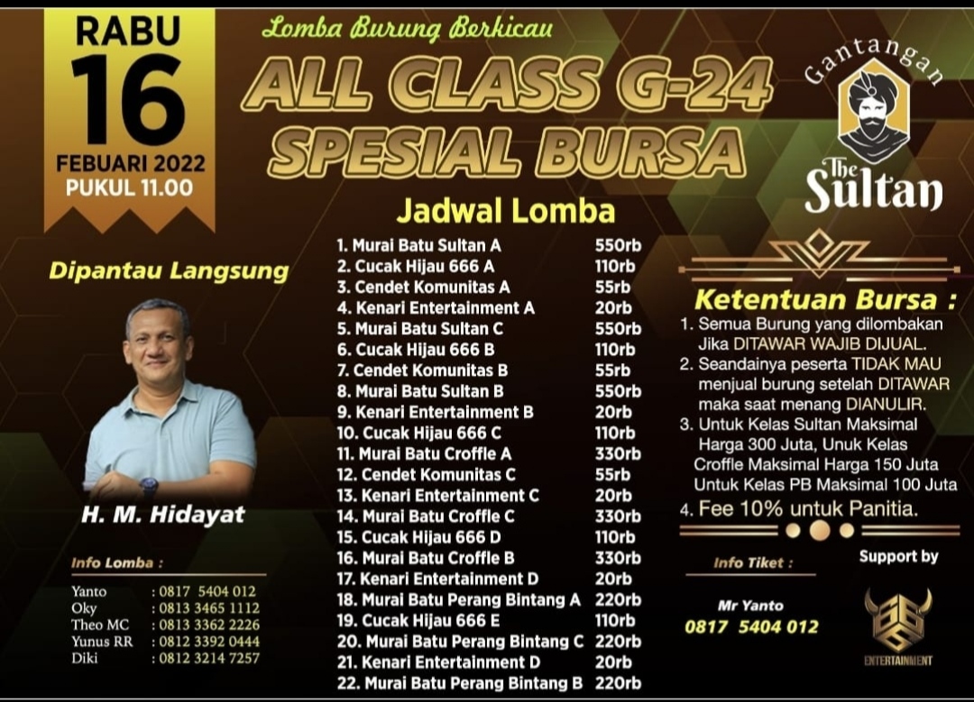 Karena sudah dijabarkan di awal, diharapkan peserta mematuhinya. Sedangkan untuk harga tiket, dibuka mulai harga 20 ribu rupiah untuk kelas Entertainment yang diisi Kenari. Sampai yang tertinggi Kelas Murai Batu Sultan A, B dan C dengan harga tiket 550 ribu rupiah.